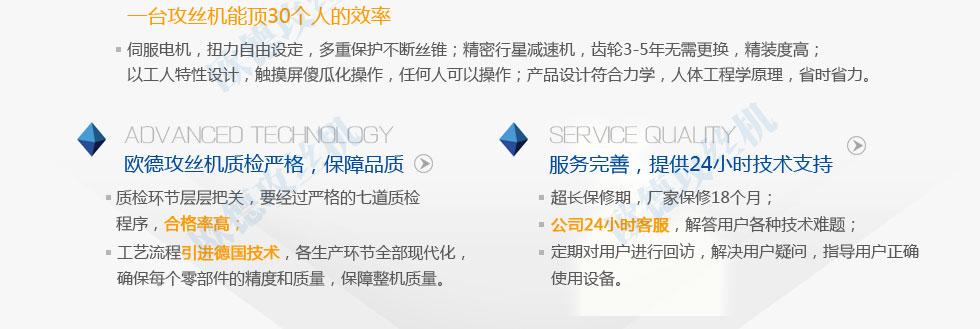 質(zhì)量求生存的方針,我們真誠歡迎新老客戶選用我公司產(chǎn)品。公司注冊資金1000萬元。公司以可靠的電動攻絲機質(zhì)量和合理的價位打動眾多消費者。公司創(chuàng)造了一流的售后服務。我公司一如既往地堅持數(shù)控攻絲機服務第一的宗旨。我公司以只有最好的精神指導各項工作大力塑造品牌。我公司新廠區(qū)擁有齊全的現(xiàn)代化生產(chǎn)設備。充分利用區(qū)域和行業(yè)優(yōu)勢。精誠服務贏信譽是我們的鋼筋上絲機質(zhì)量方針。進取精神是企業(yè)能與時俱進的動力和發(fā)展的源泉。鋼筋上絲機